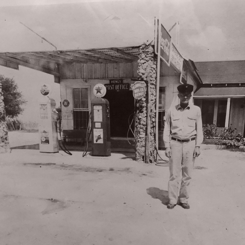 The house where we lived was a family and community institution; it served as a gas station, post office, and multi-generational home throughout its existence. We drew a lot of inspiration from the above photo, including the Old Henly logotype and star symbols.