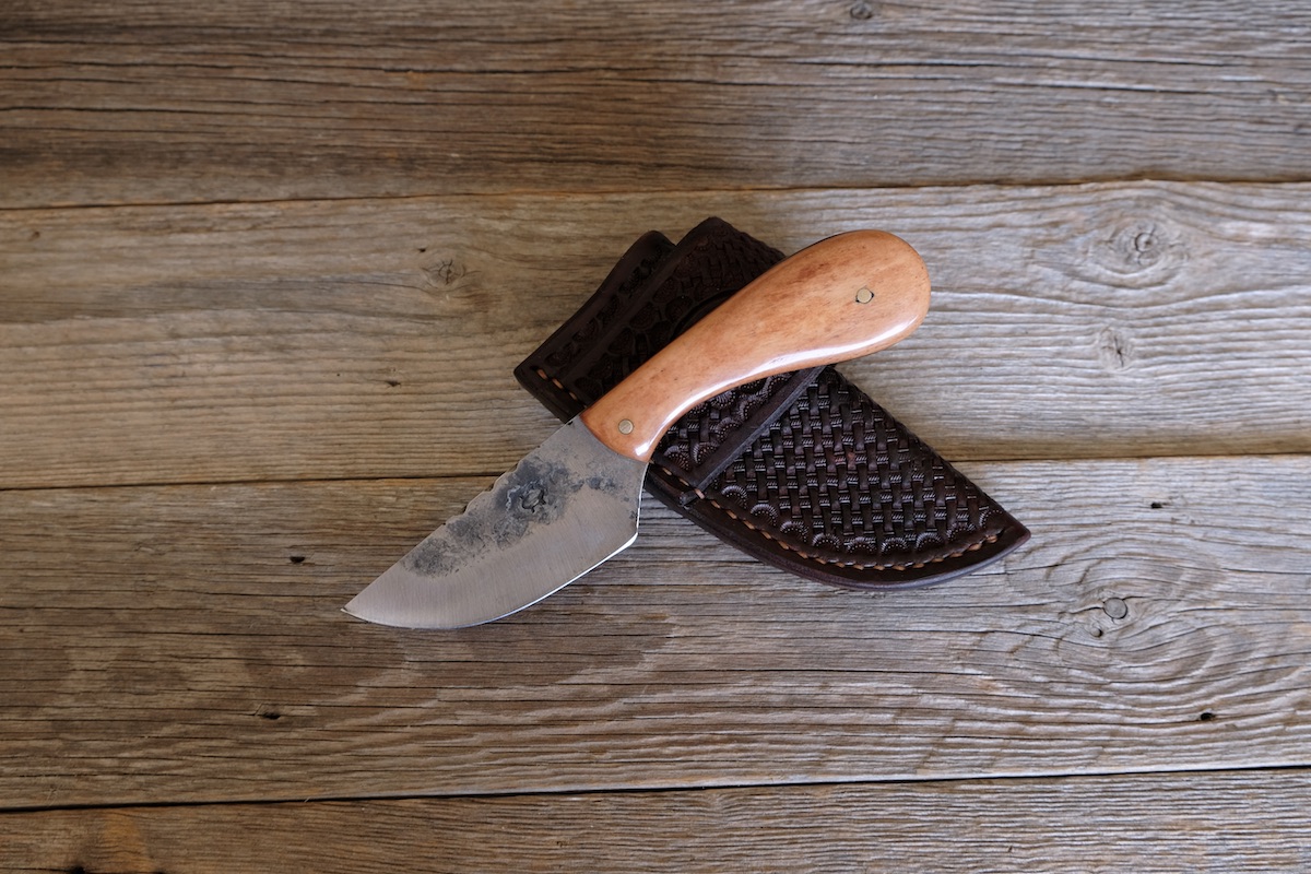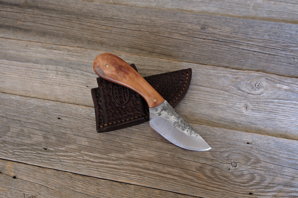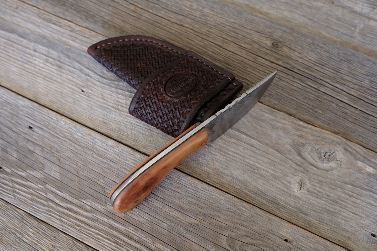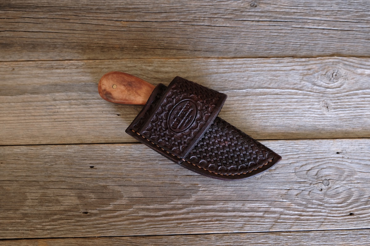 Hand-tooled, horizontal carry sheath made with Hermann Oak leather