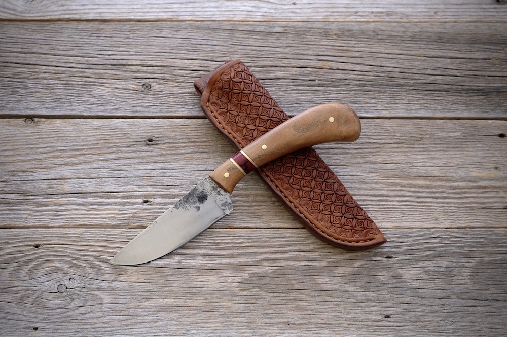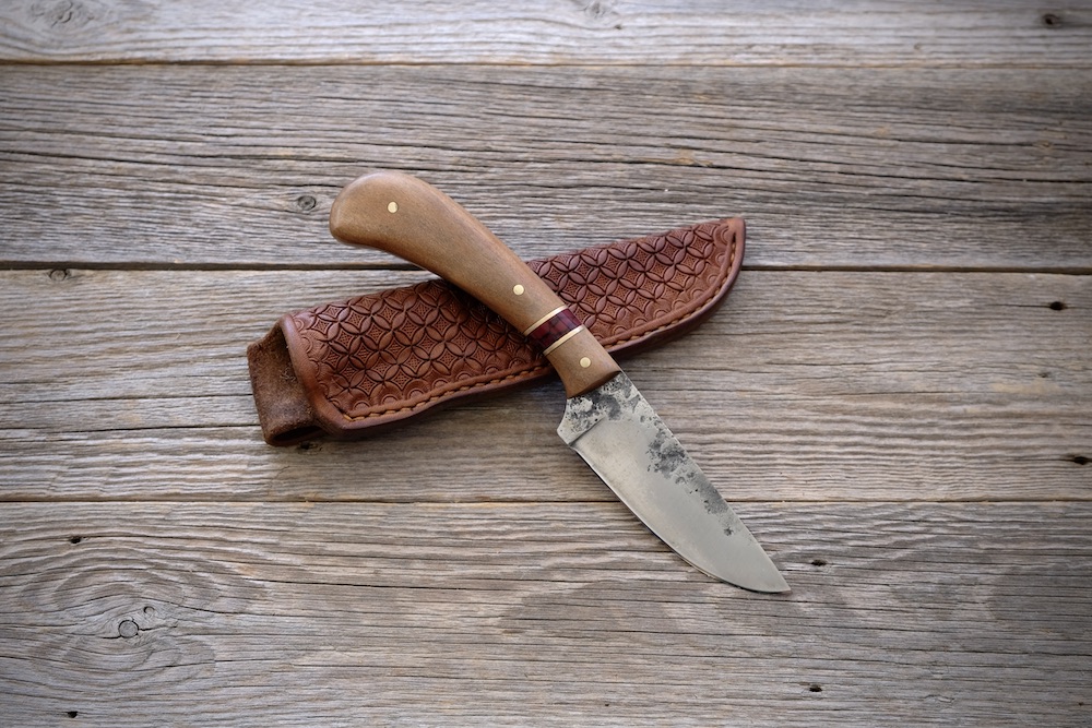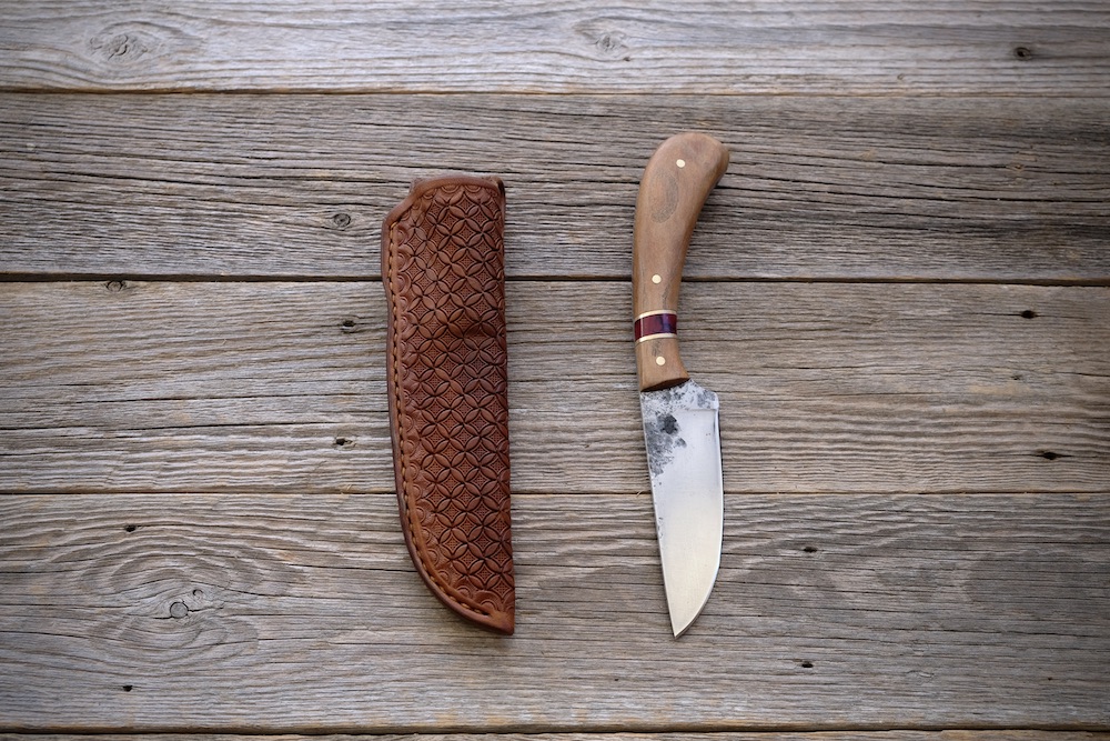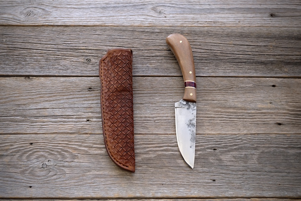 Hand-tooled, vertical pouch sheath made with Hermann Oak leather
