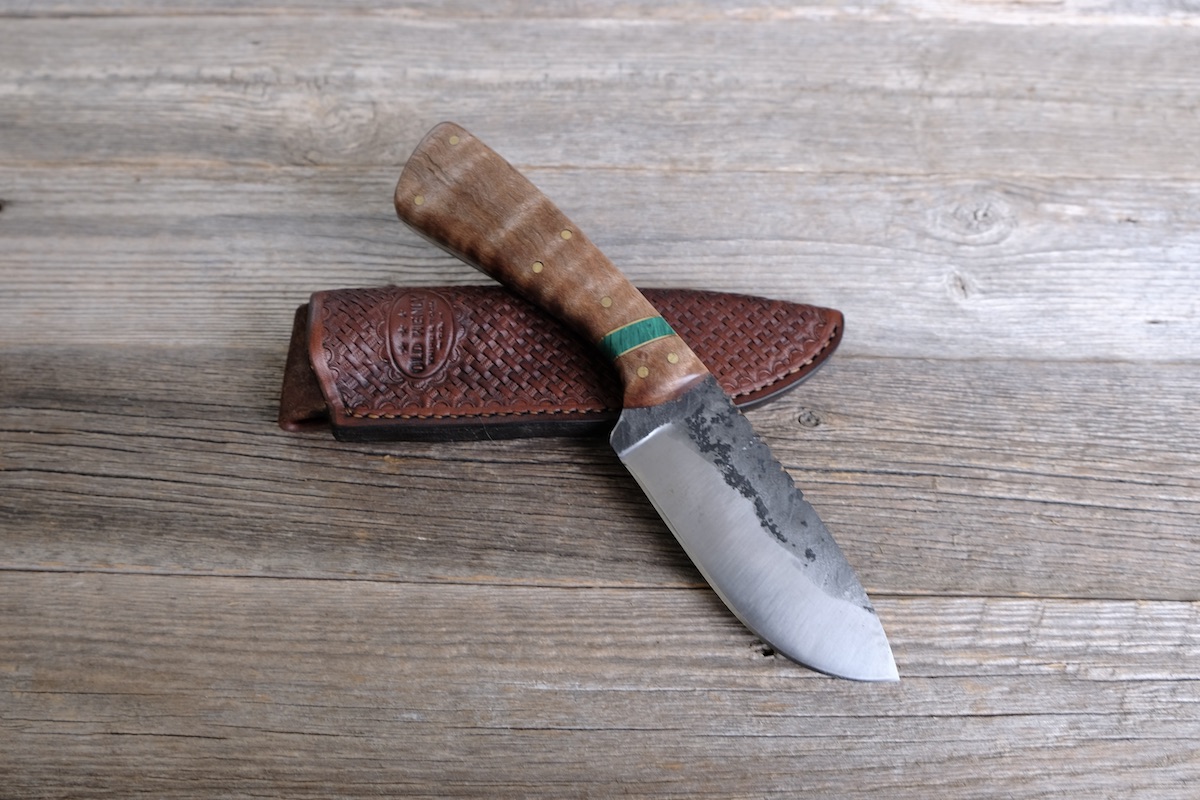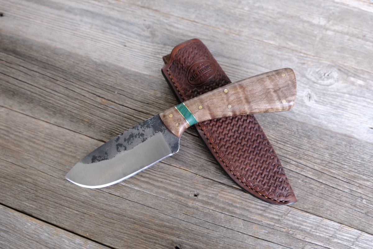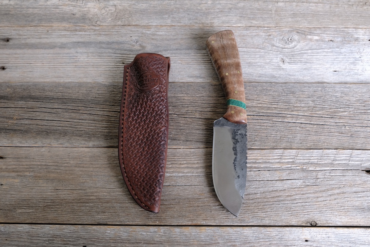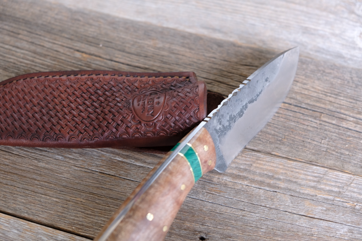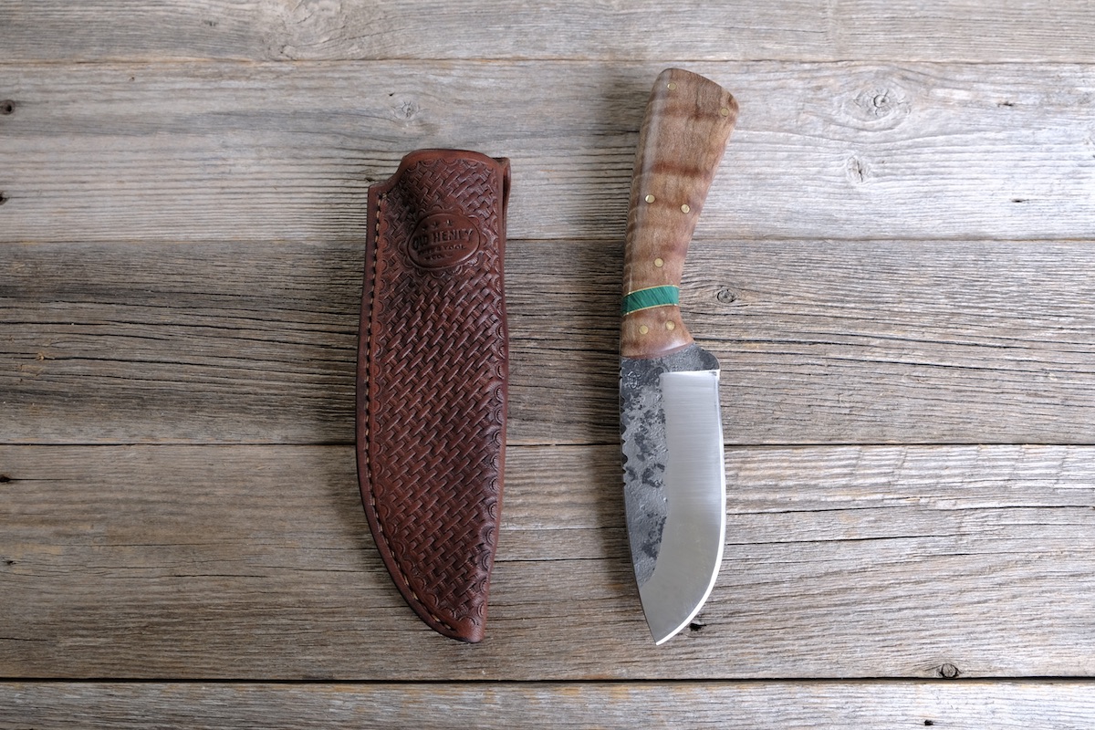 Hand-tooled, vertical pouch sheath made with Hermann Oak leather