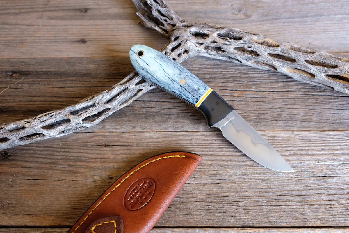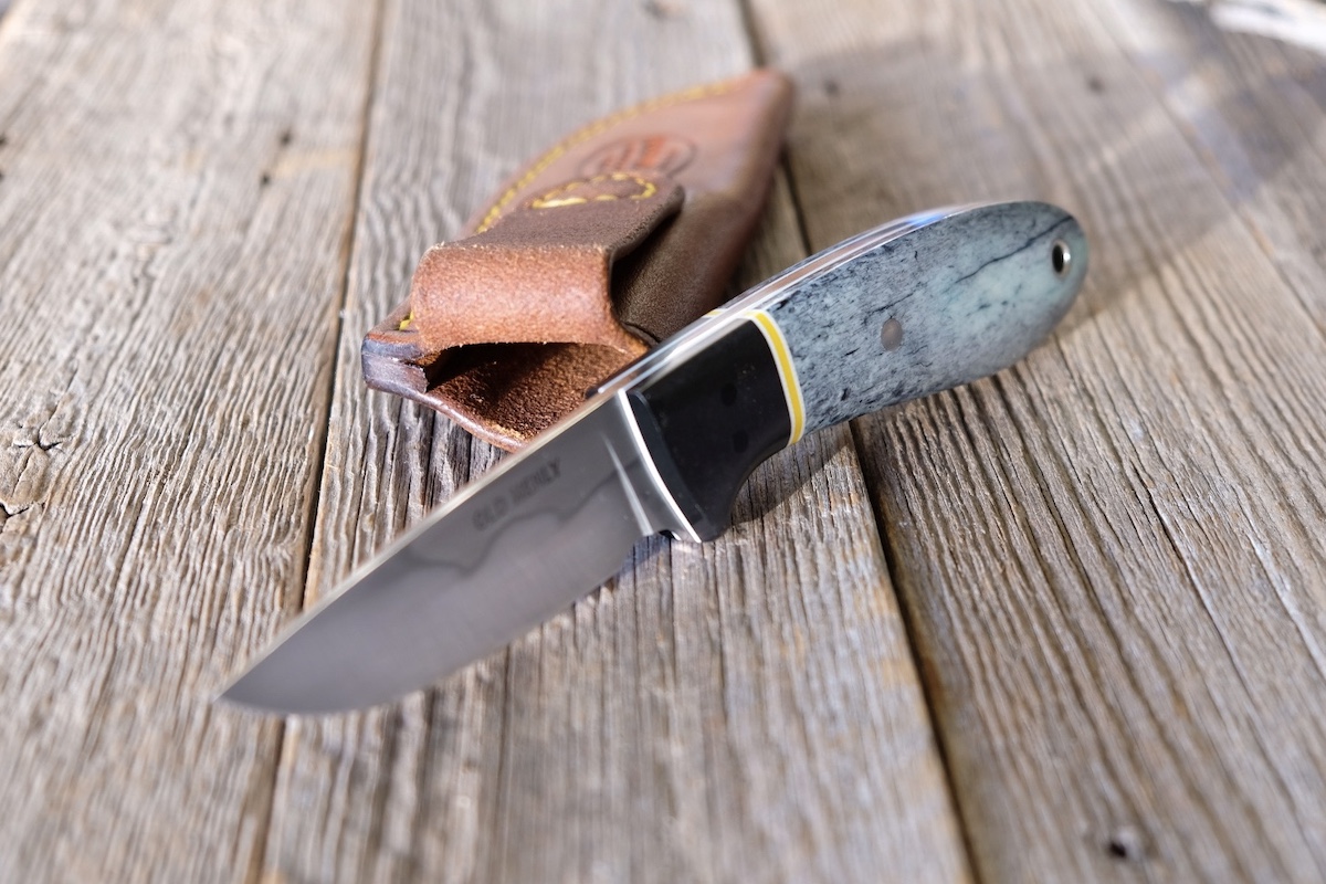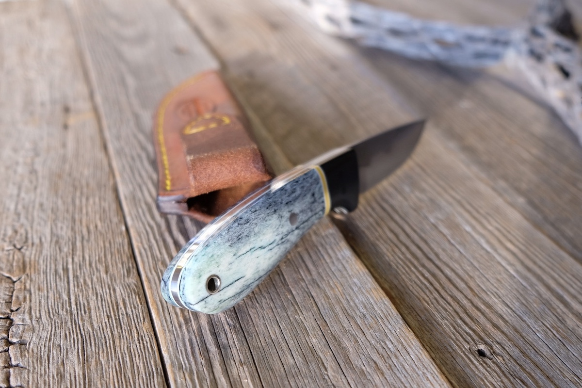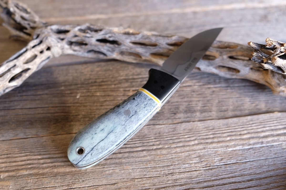 - Handle: Black richlite bolster, white/yellow G10 spacer, and giraffe bone
