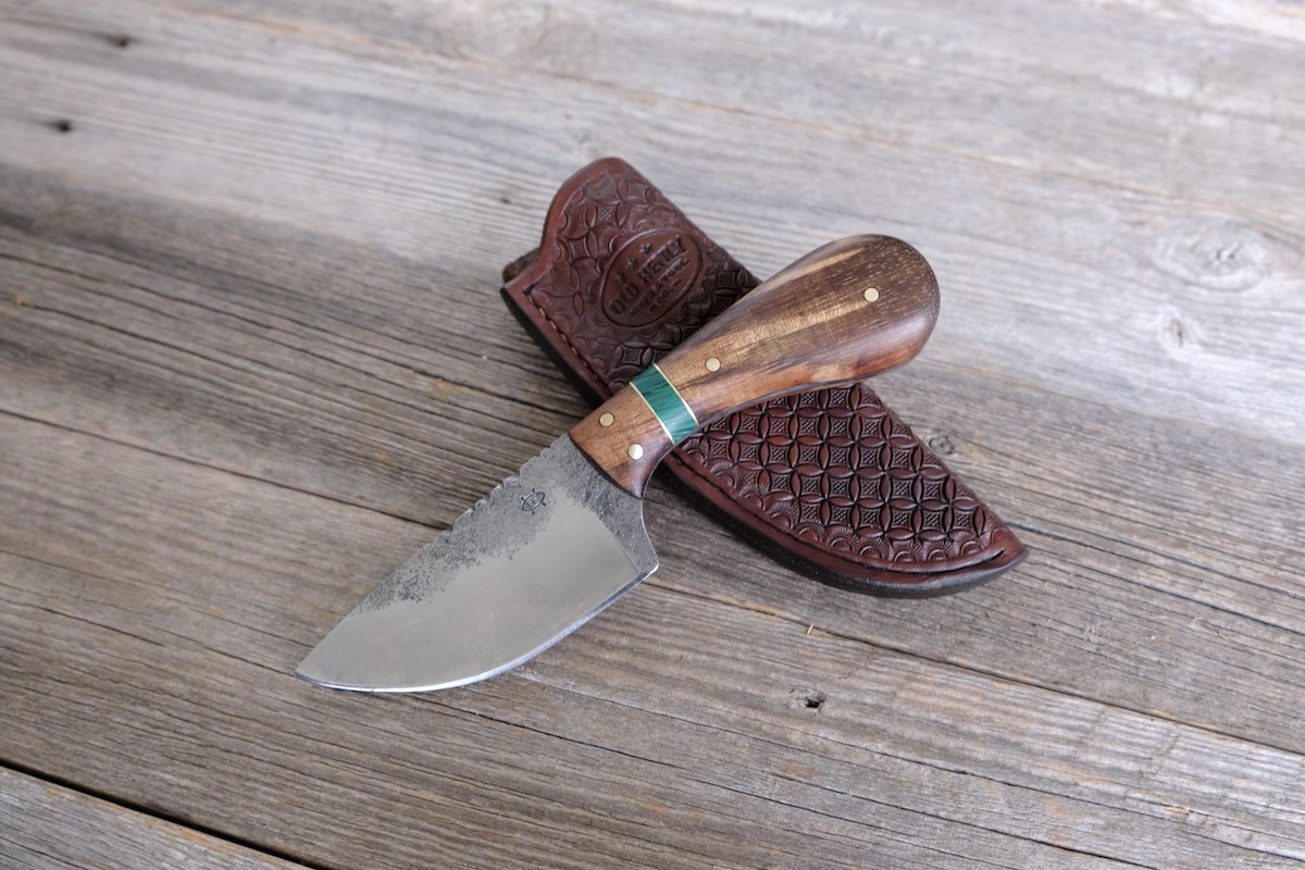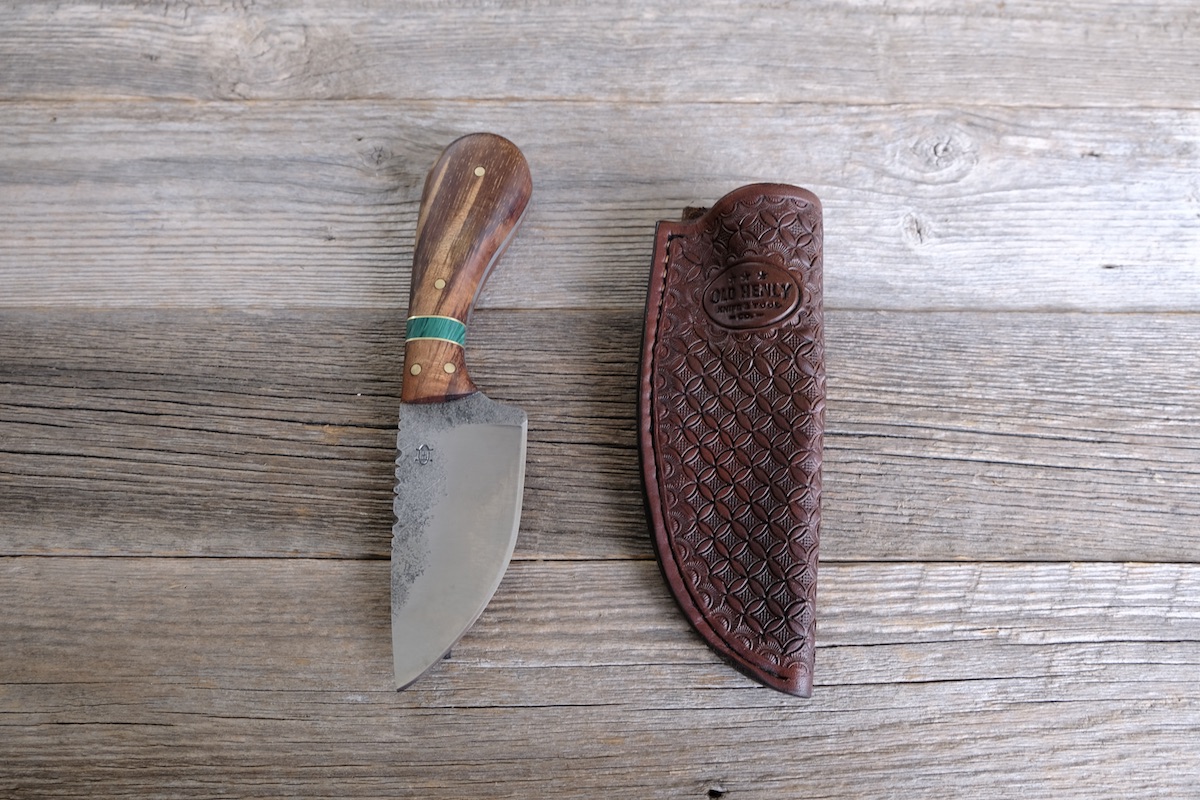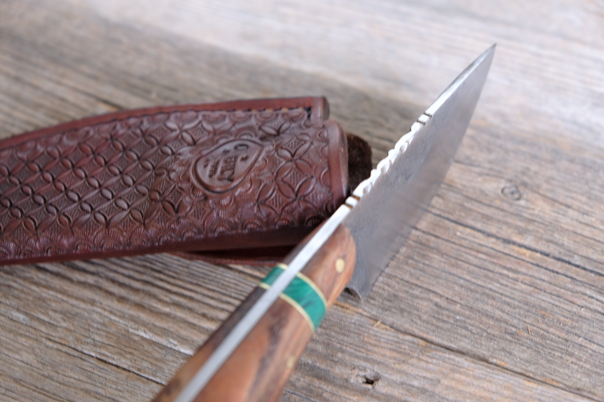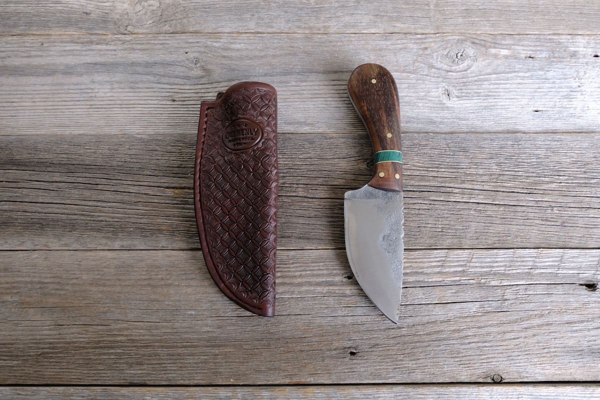 Hand-tooled, vertical pouch sheath made with Hermann Oak leather