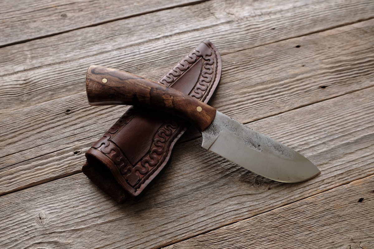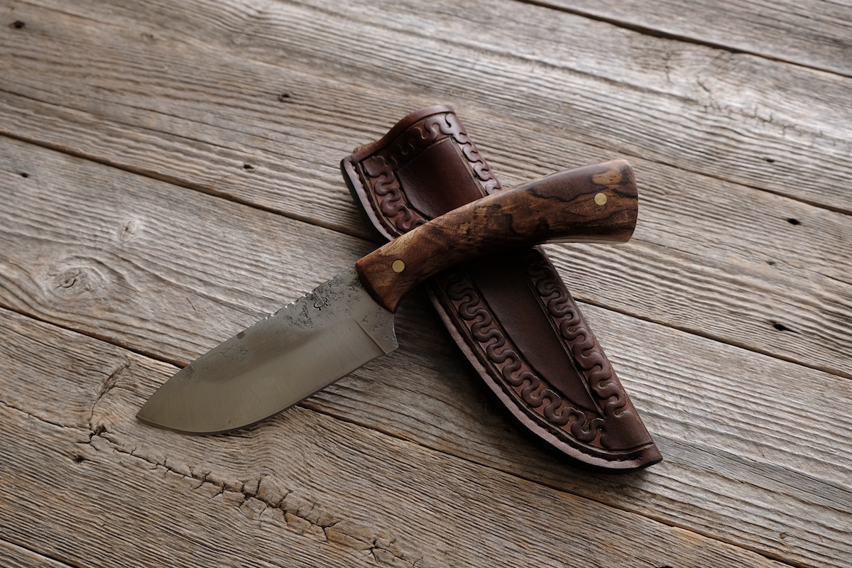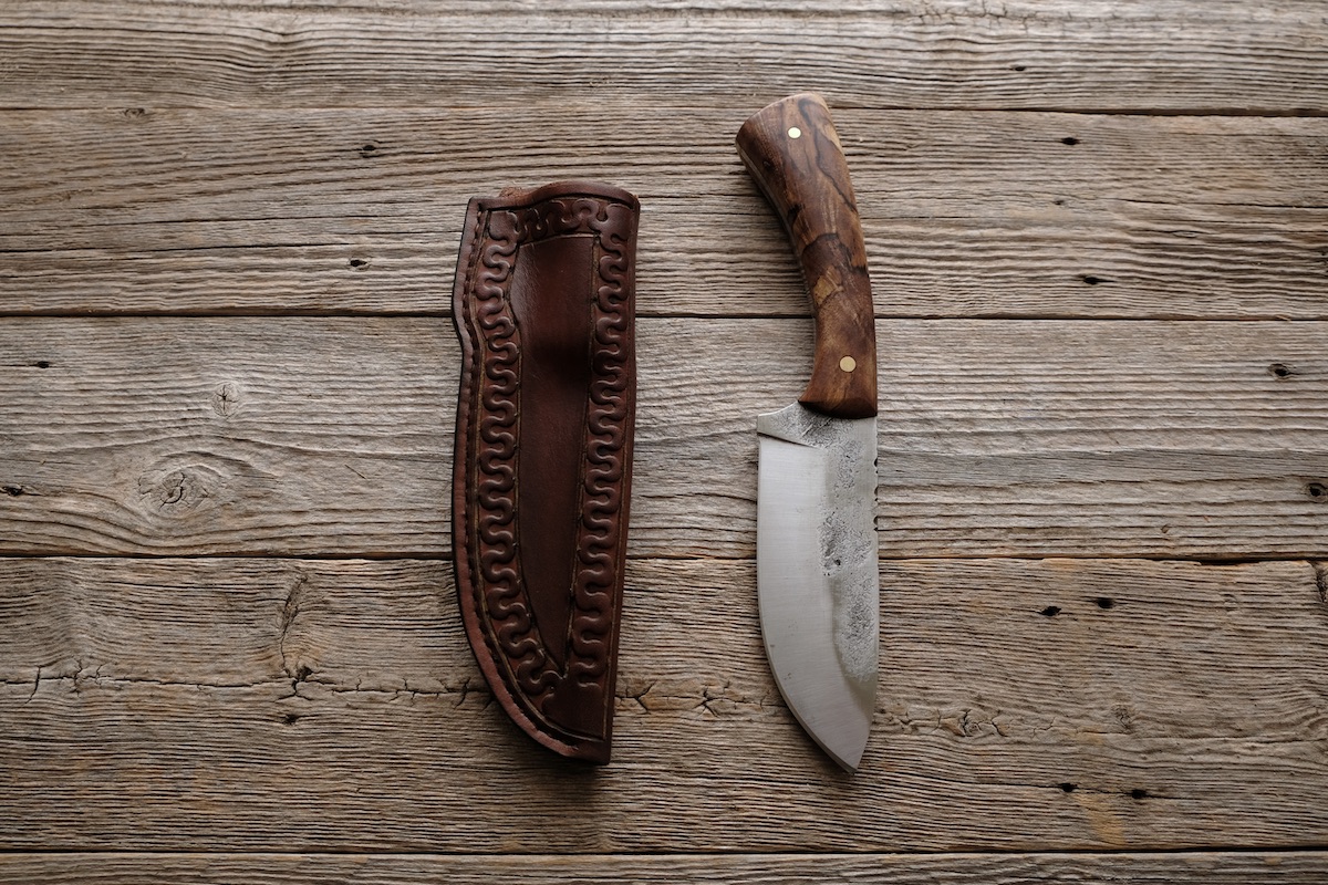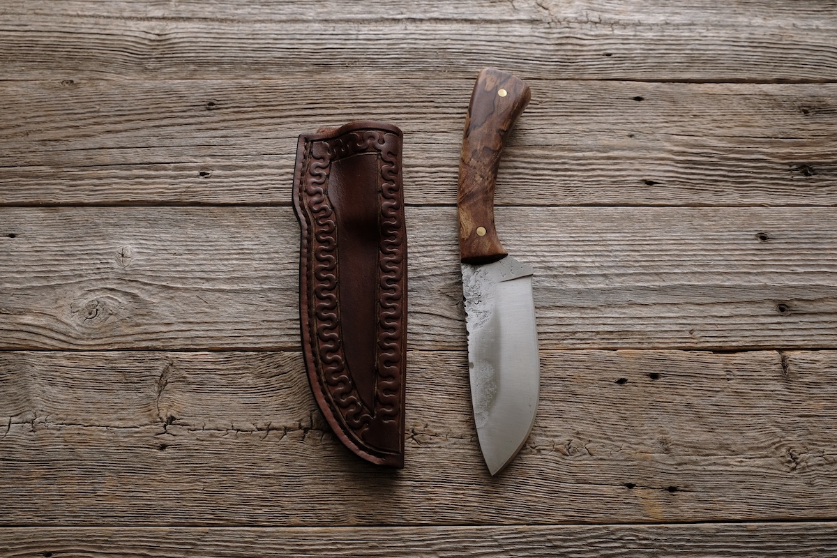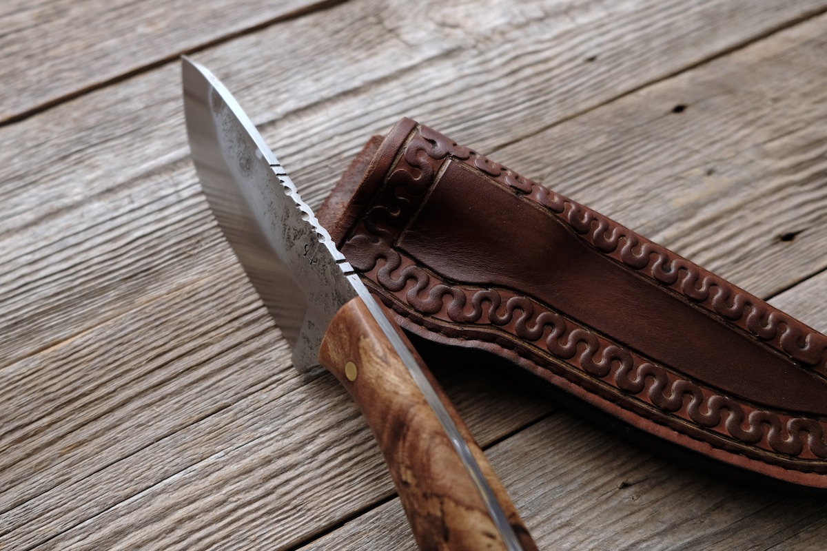 Hand-tooled, vertical pouch sheath made with Hermann Oak leather