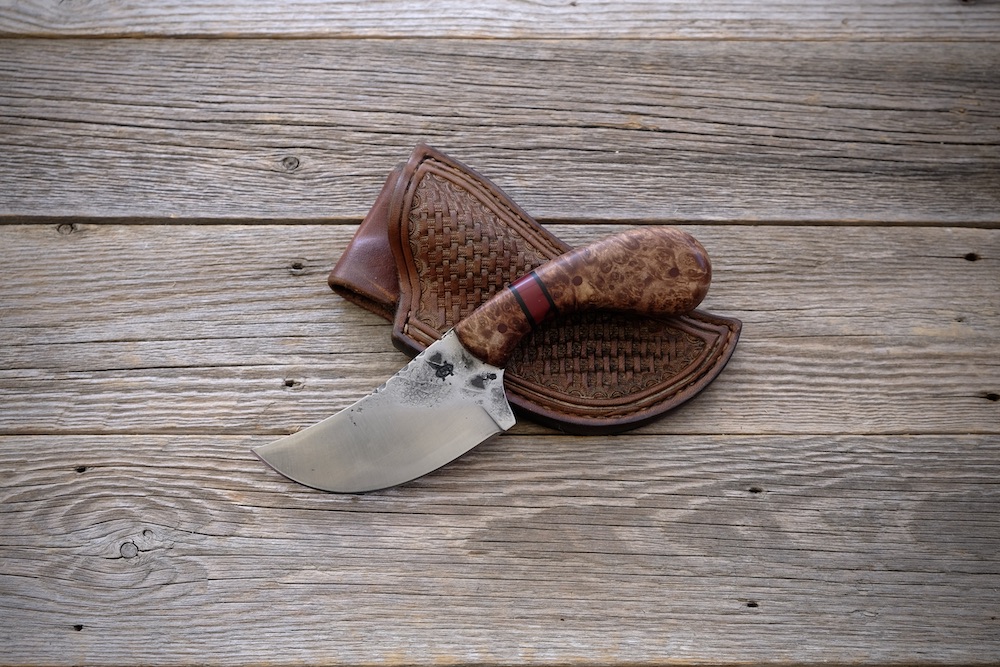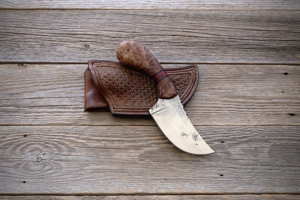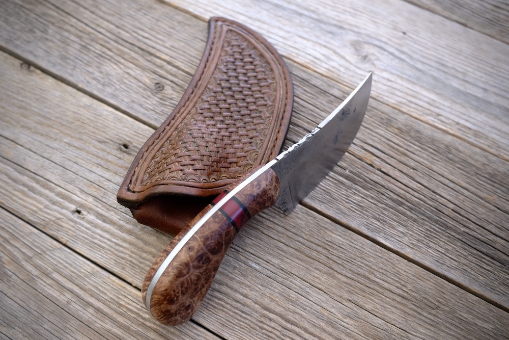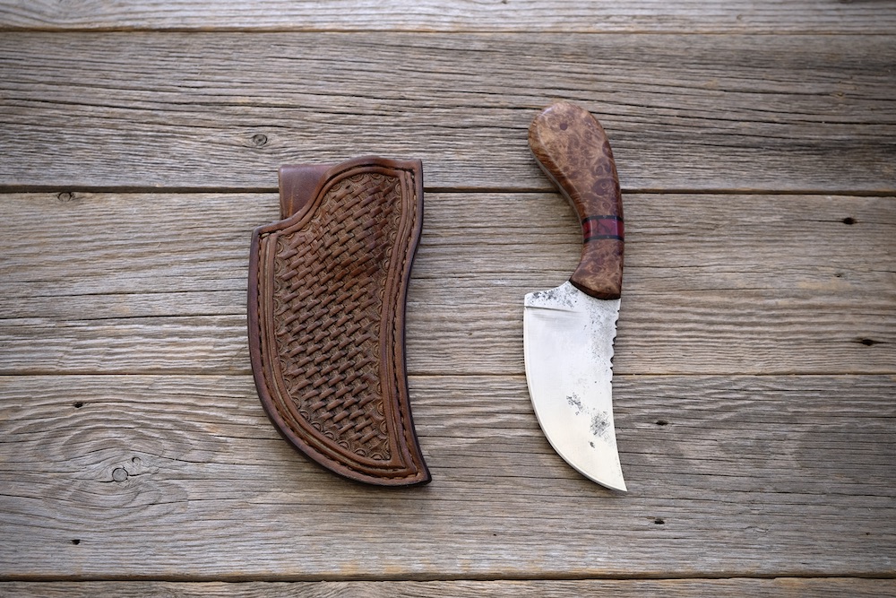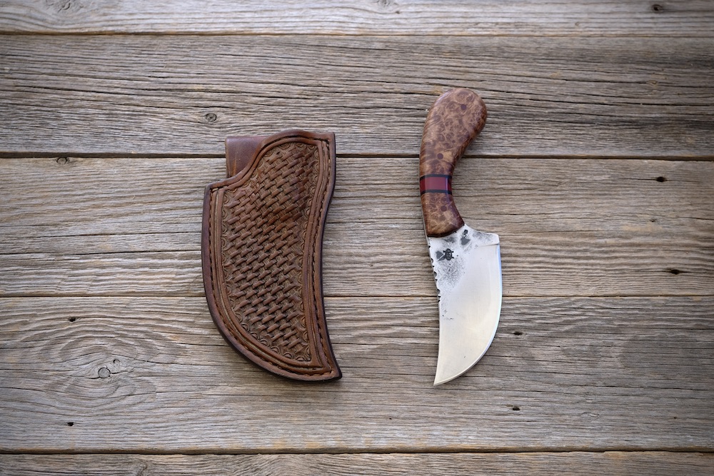 Hand-tooled, vertical pouch sheath made with Hermann Oak leather