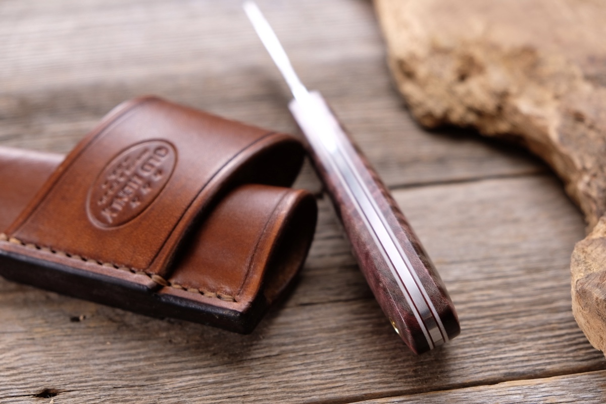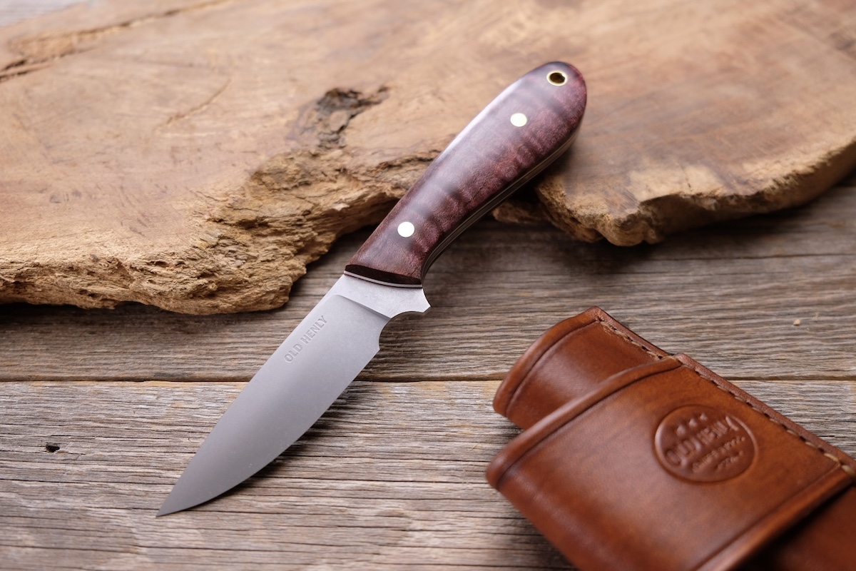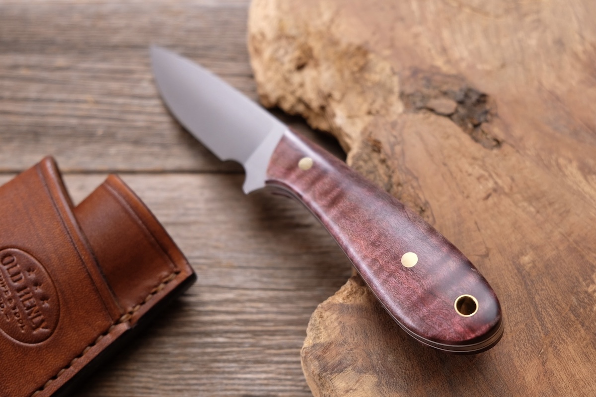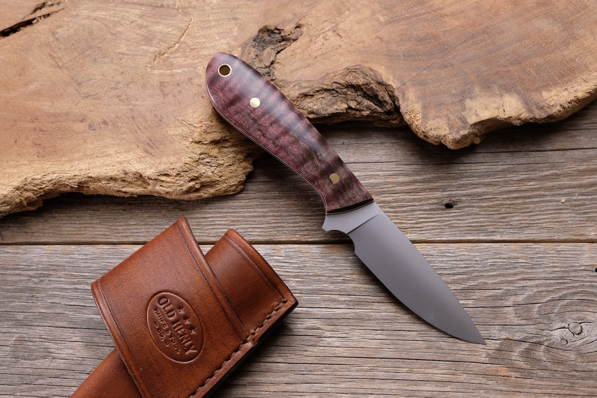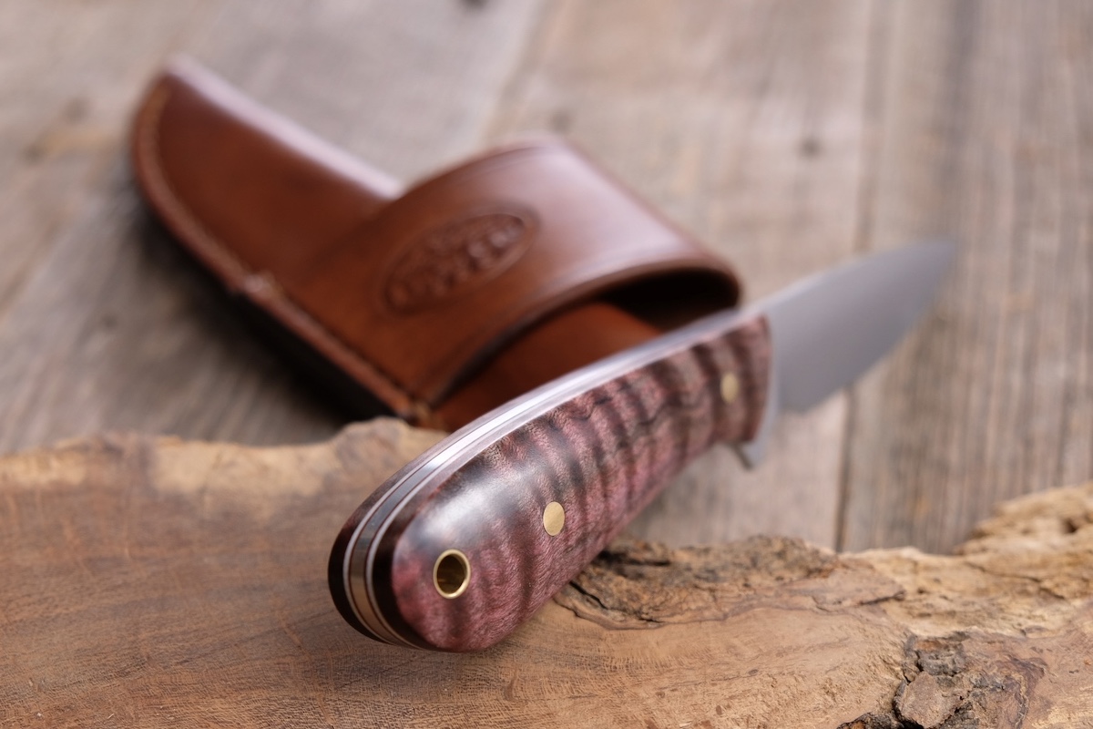 • Handle: Mauve colored curly maple with some nice chatoyance, stabilized and dyed in-house