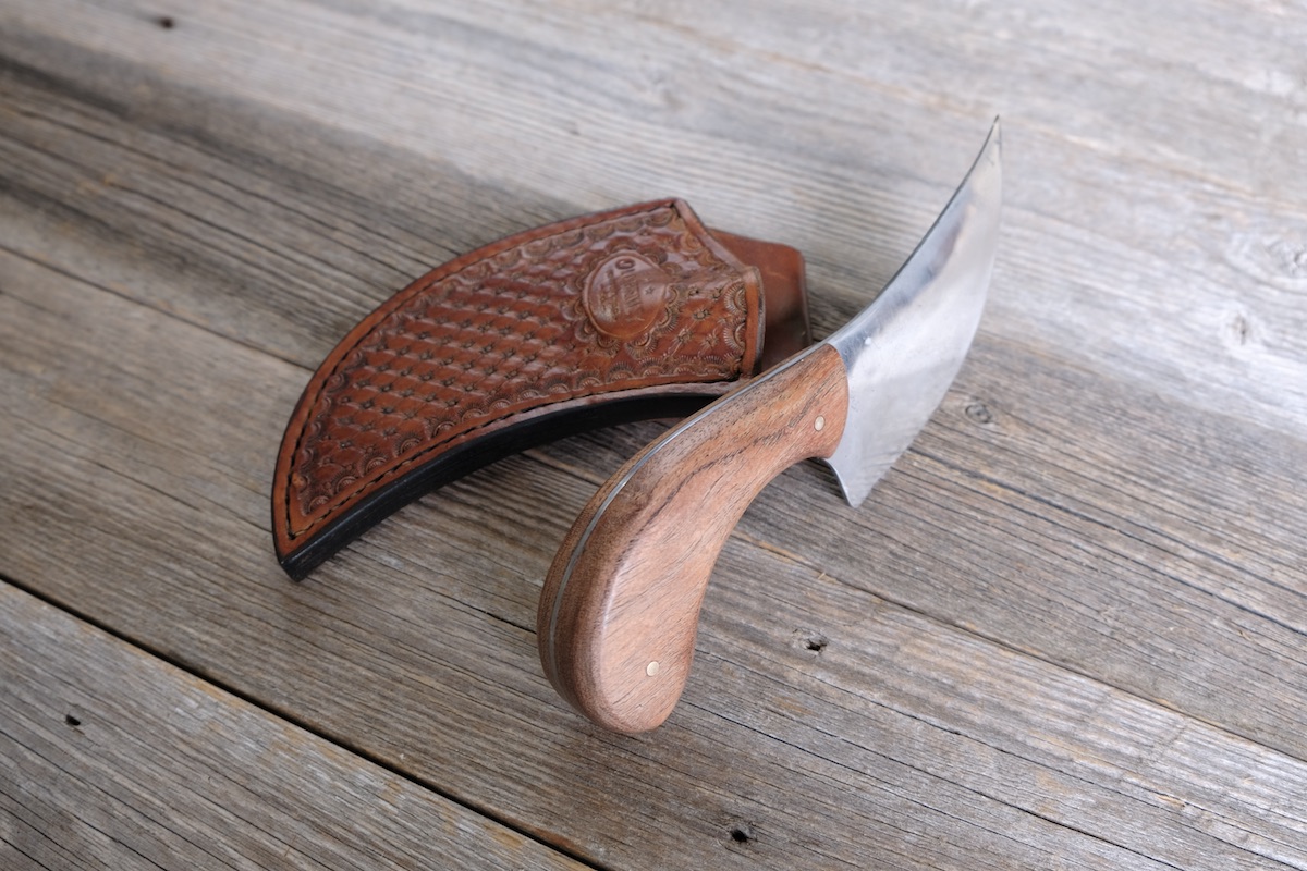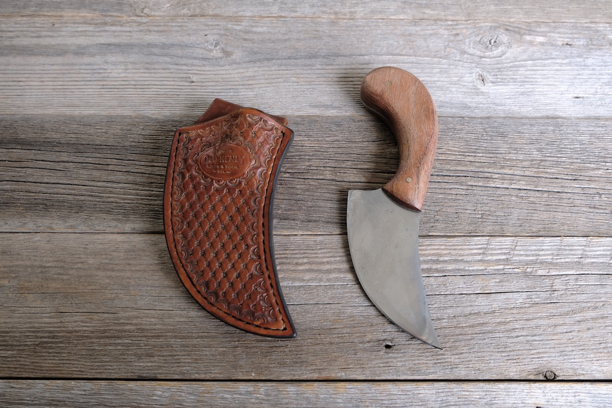 Hand-tooled, vertical pouch sheath made with Hermann Oak leather