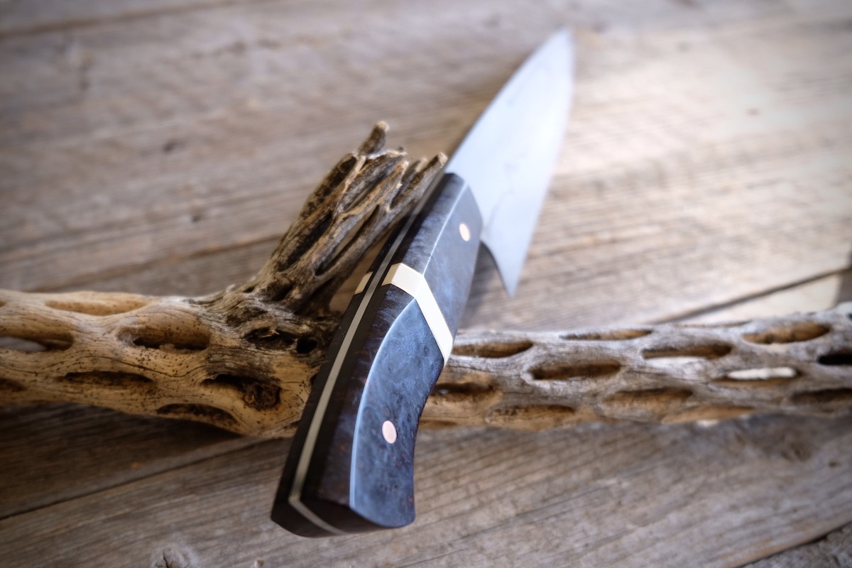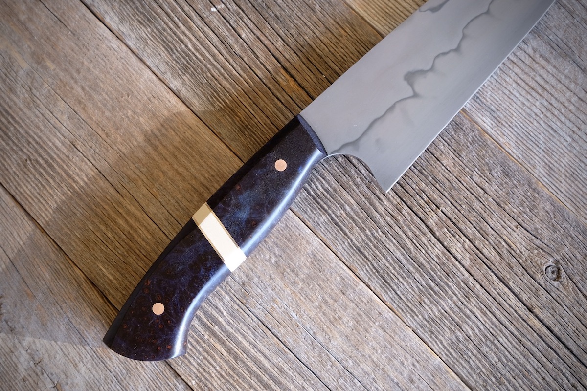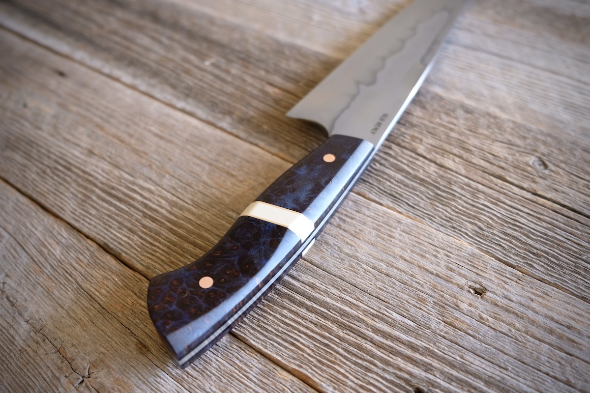 Handle: Midnight blue maple burl, stabilized and dyed in-house