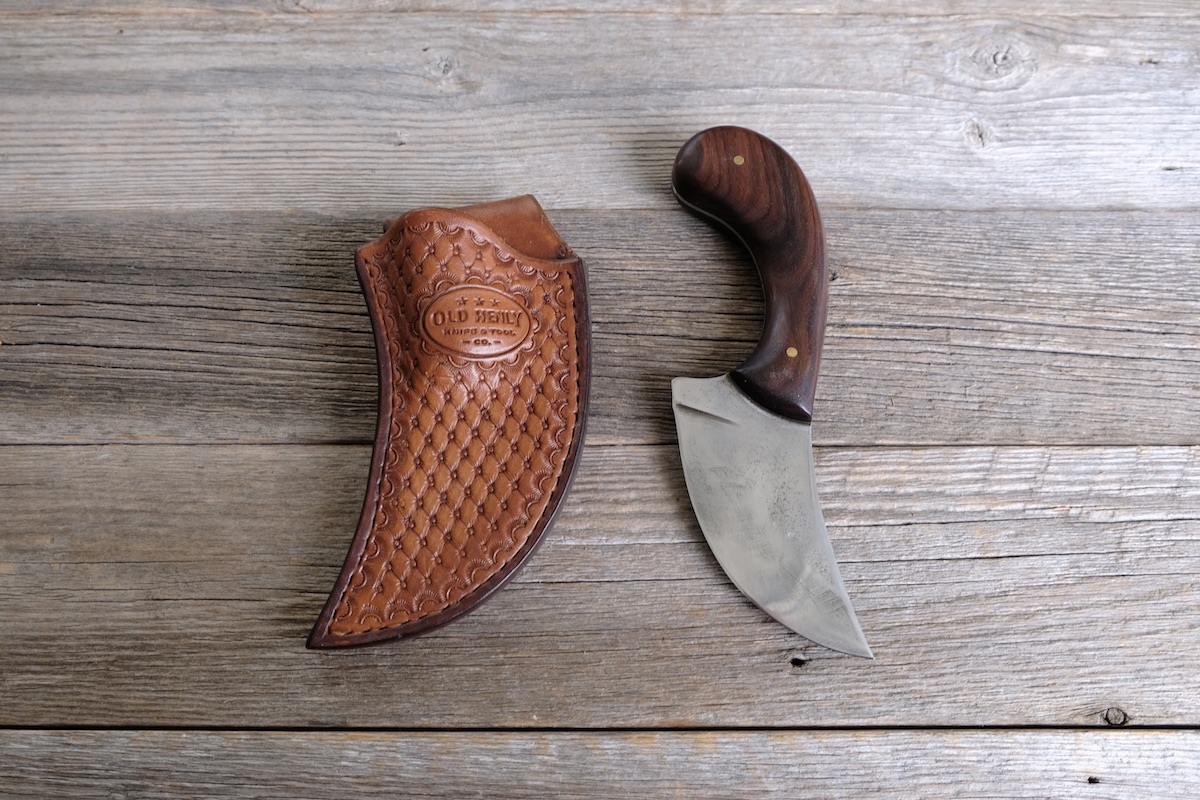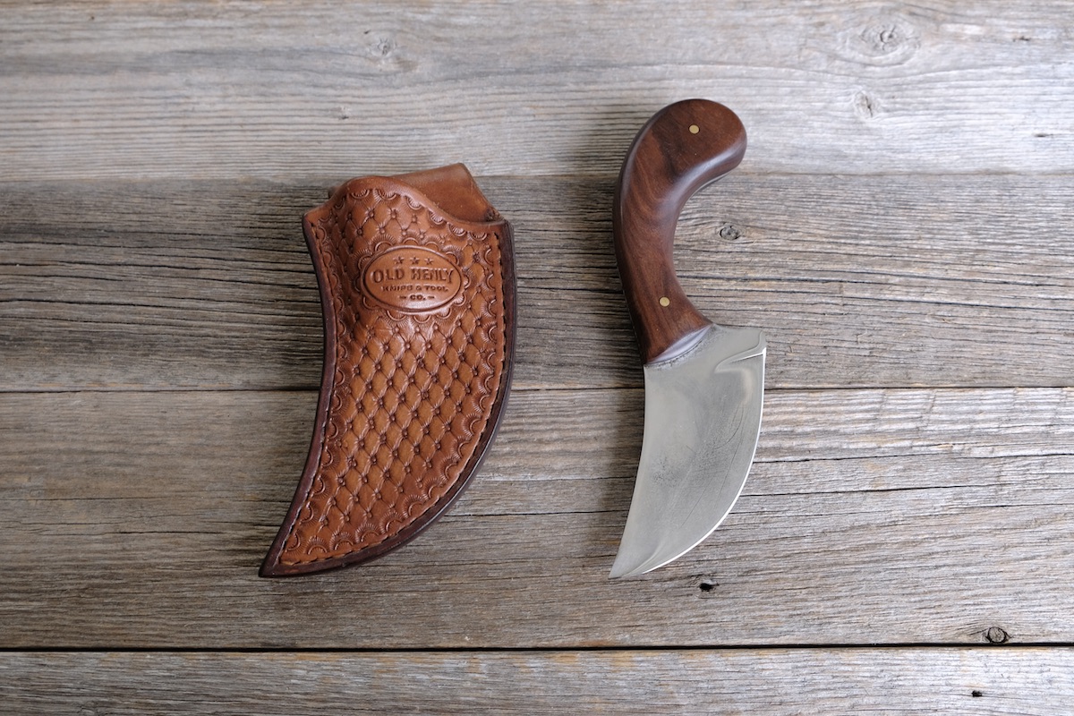 Hand-tooled, vertical pouch sheath made with Hermann Oak leather