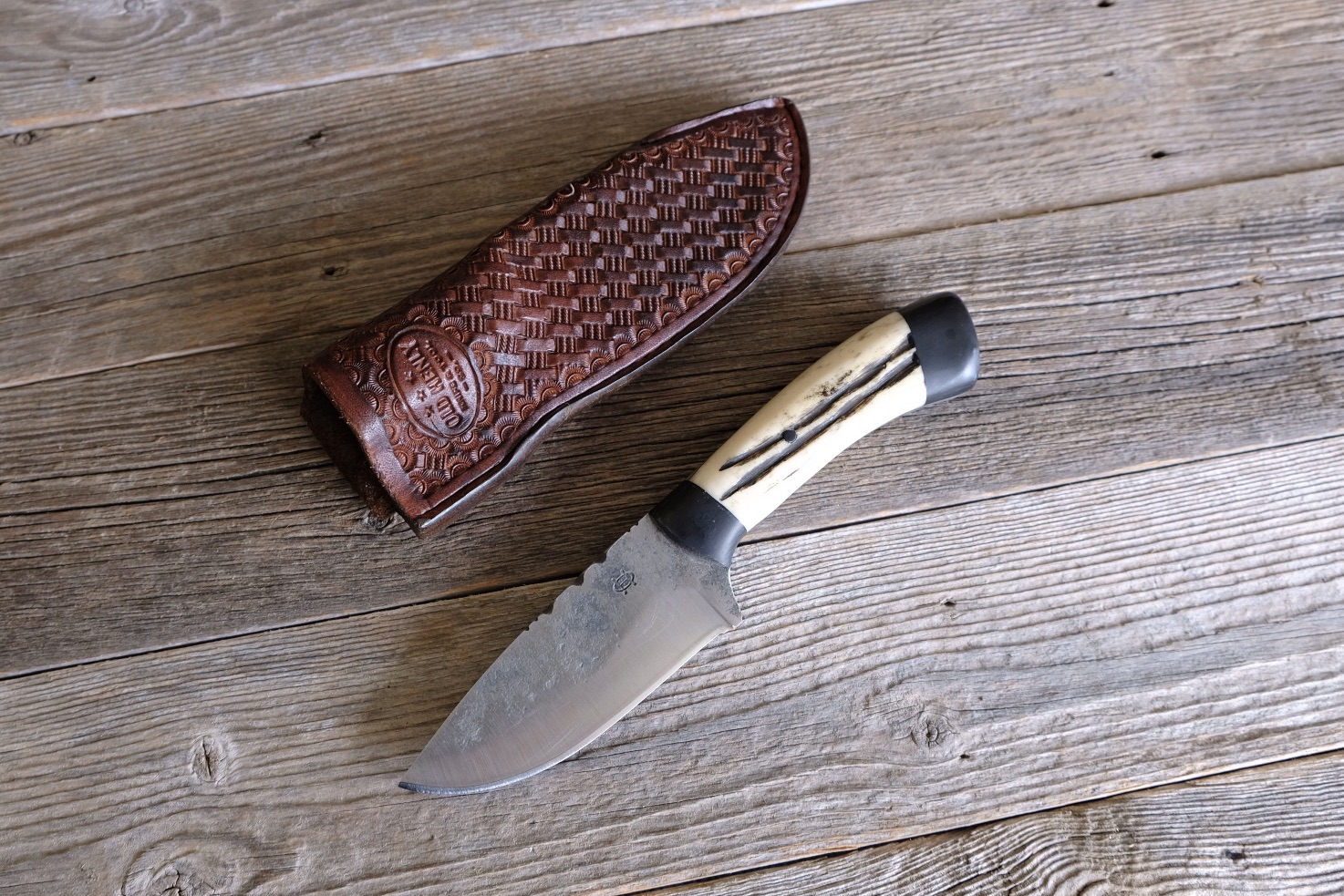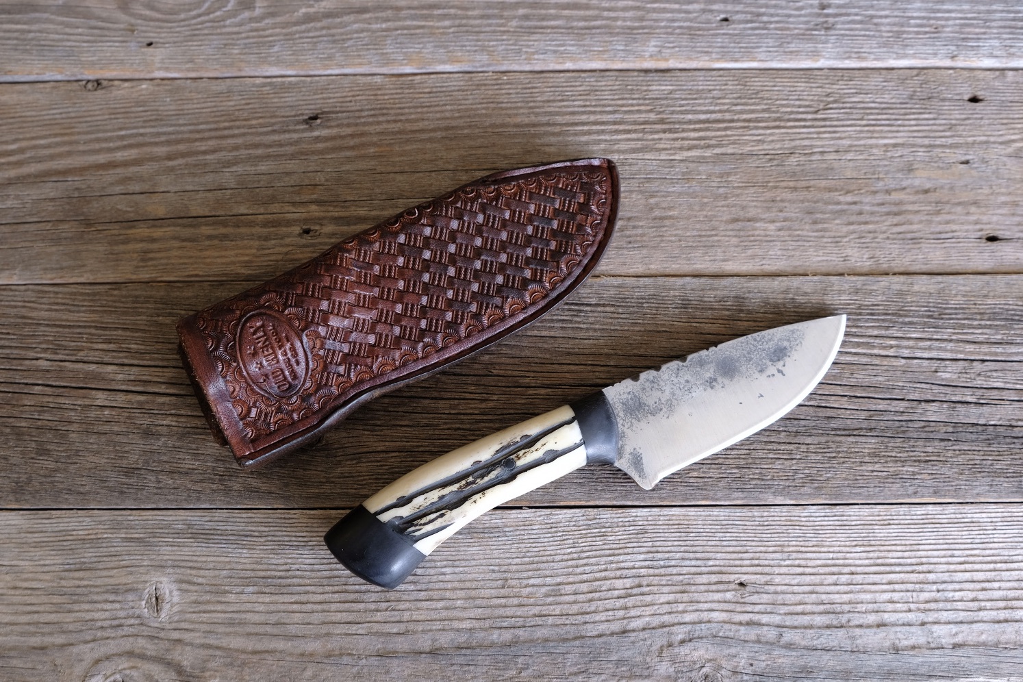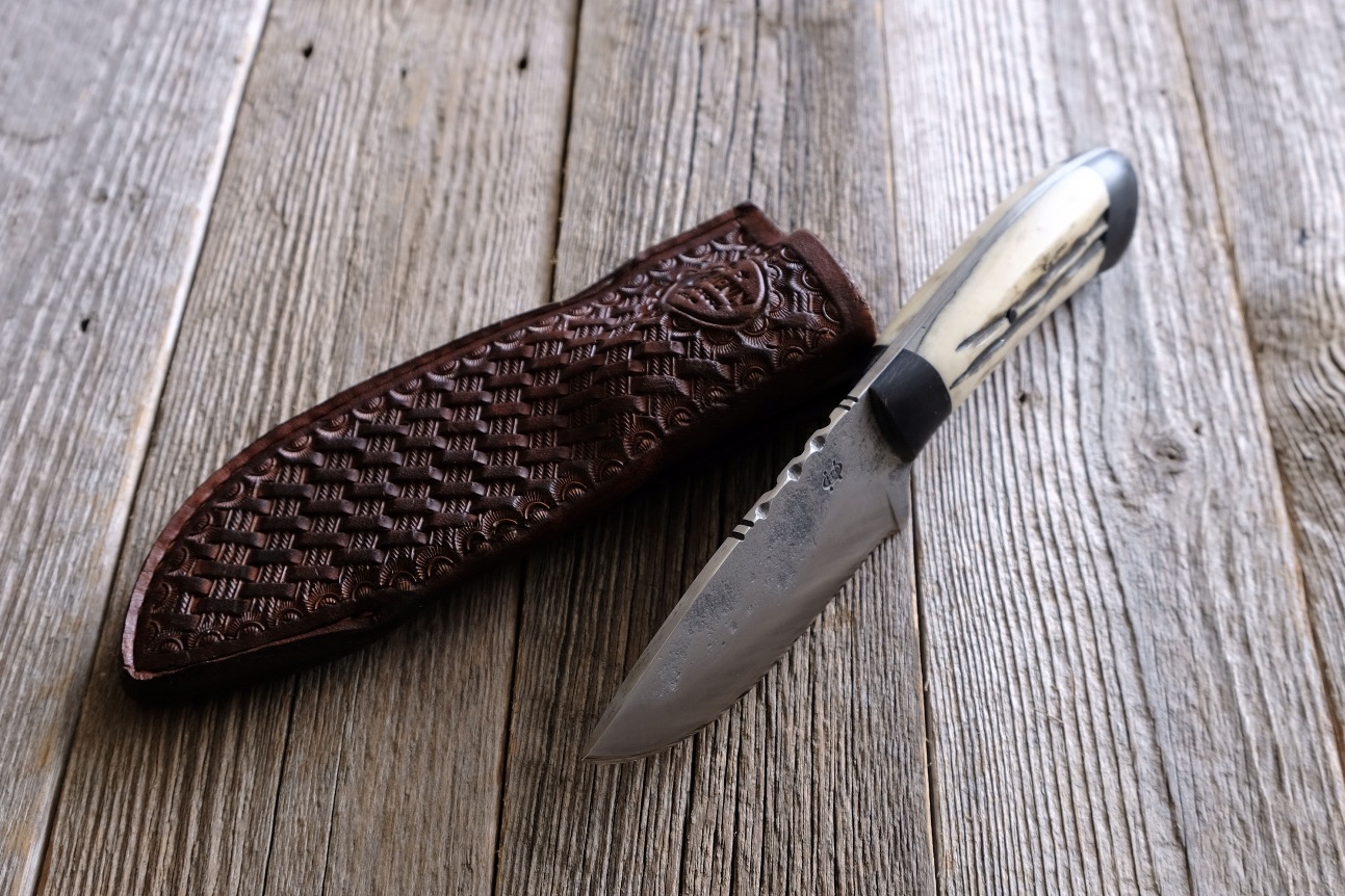 Hand-tooled, vertical pouch sheath made with Hermann Oak leather