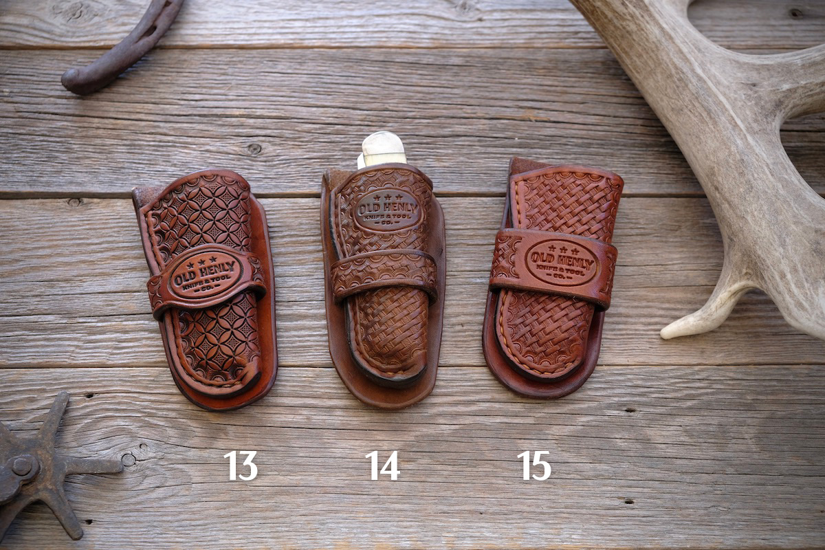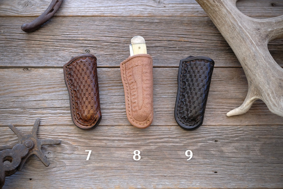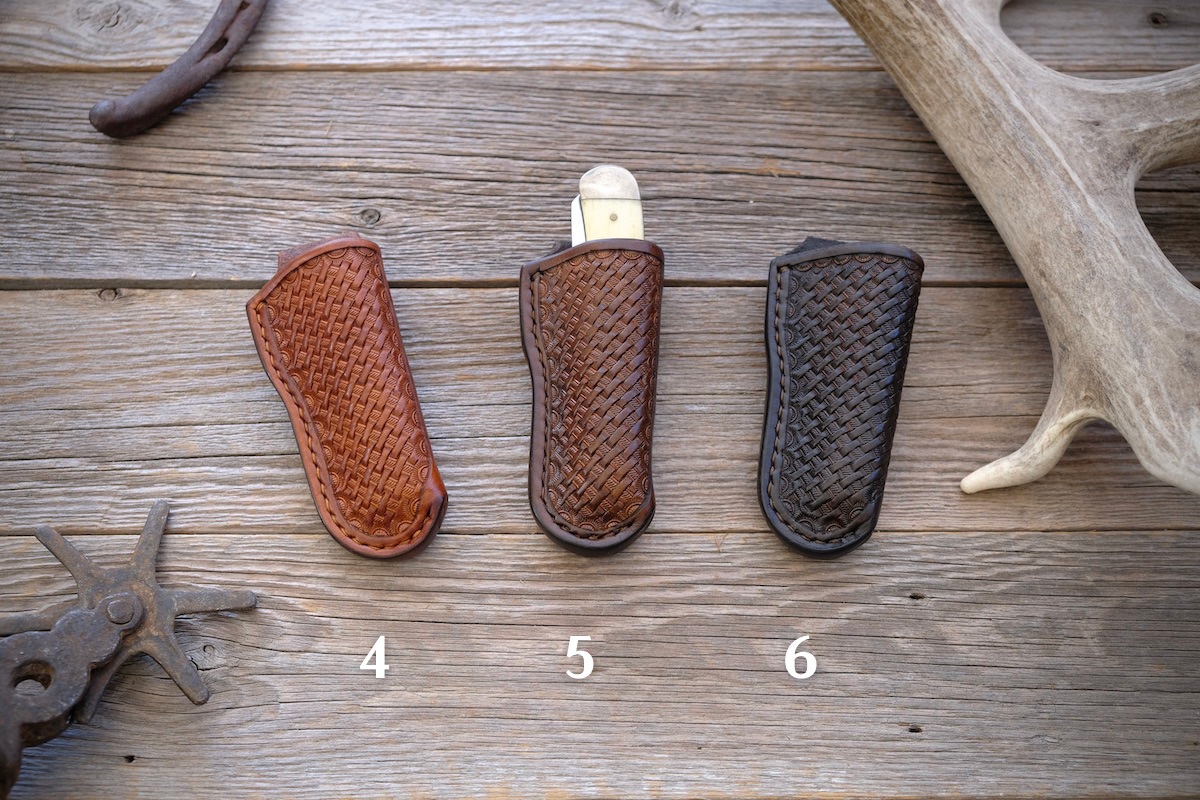 Made to fit trapper folding knives (the knife pictured is a popular Case model trapper). The Mexican loop style sheaths will accommodate slightly larger trapper designs as well, like the Moore Maker.