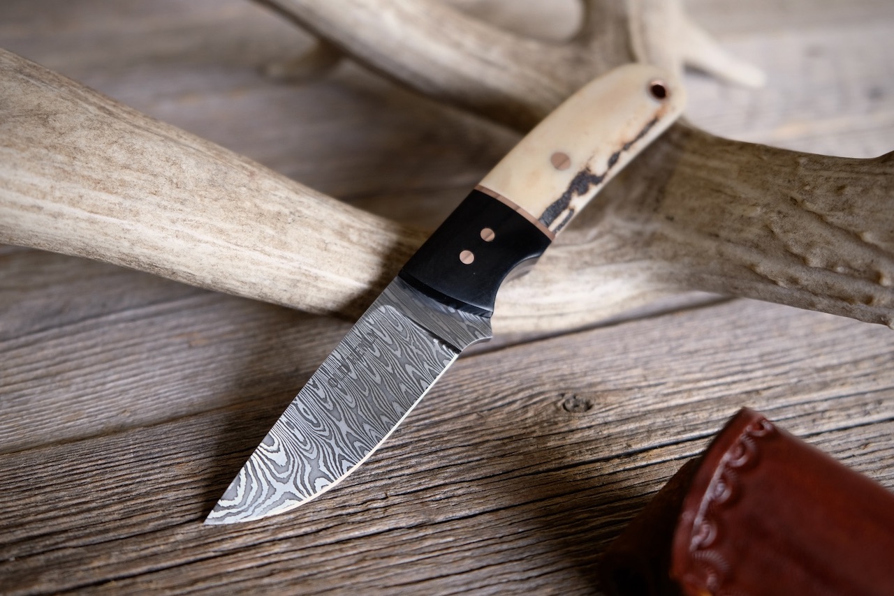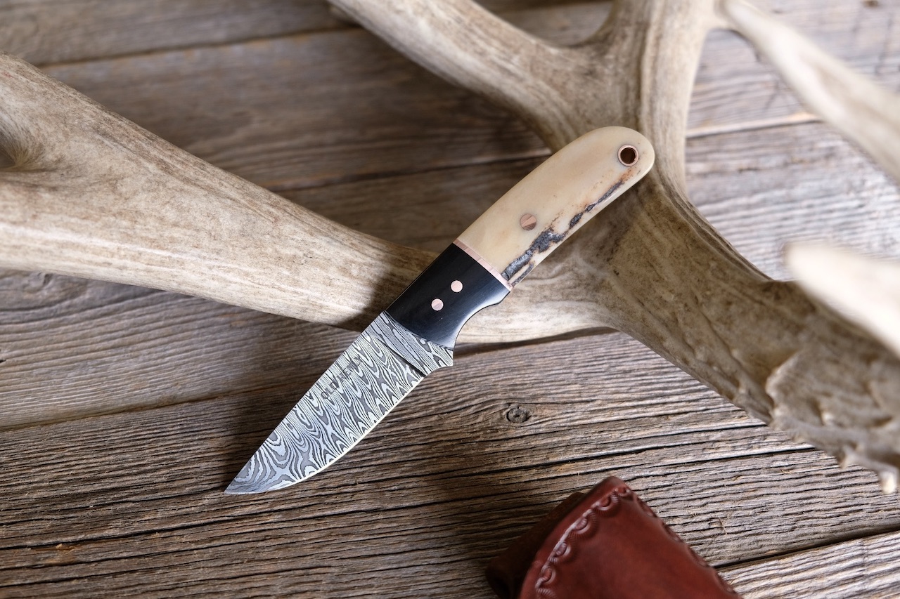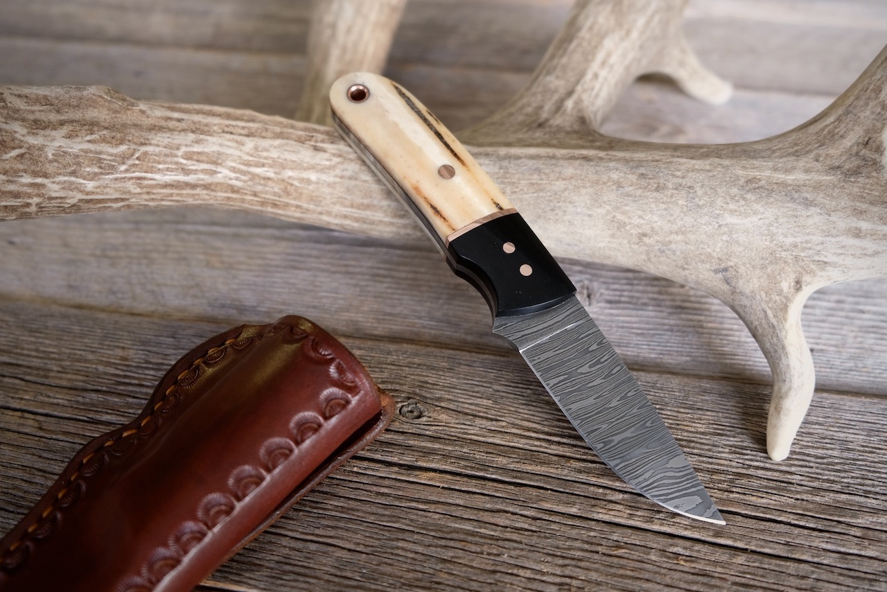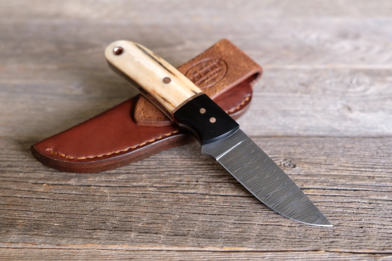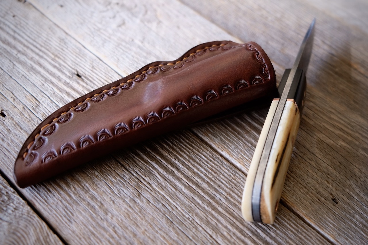 This might be our first full collaboration knife. Brady made a small billet of twist pattern damascus and sent it to me. I had just enough material to squeeze out one of my smaller profiles and decided to use some stag on the handle. My dad (Paul) made the hand-tooled sheath.