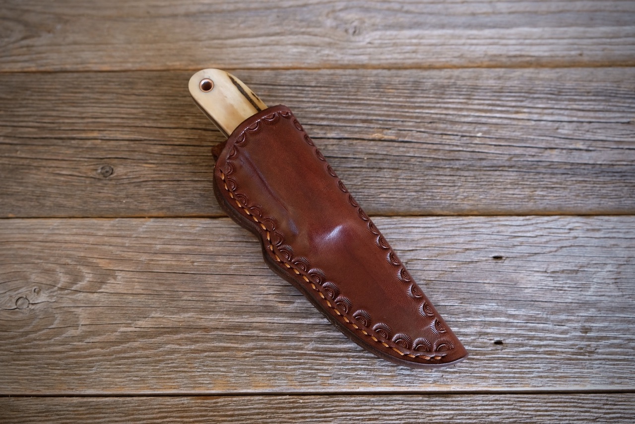 - Hand-tooled, vertical pouch sheath made with Hermann Oak leather by Paul